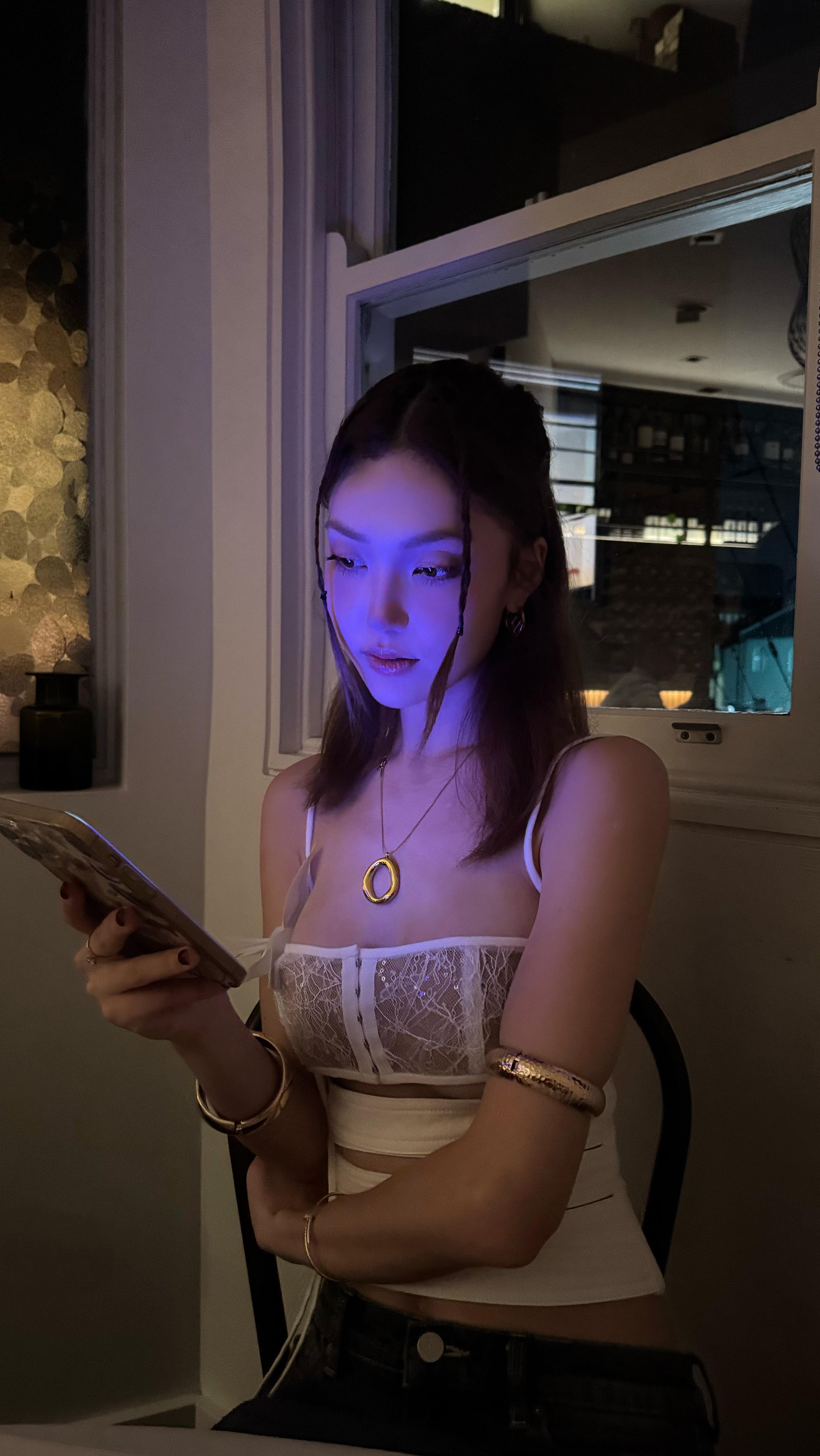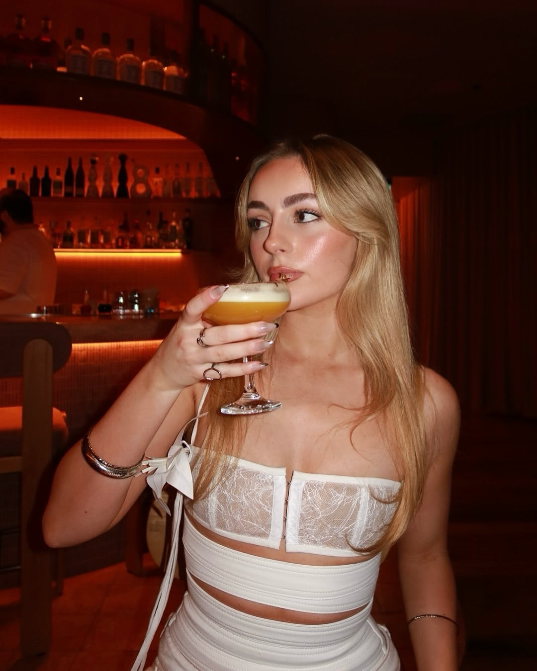 I’m the Georgia Corset Top in White, romantic, ethereal and crafted to glow against your skin. My sequin lace bust and structured poplin bodice sculpt you softly for an angelic, polished silhouette. My handmade floral shoulder detail adds a delicate couture touch, perfect for birthdays, engagements or long lunches.