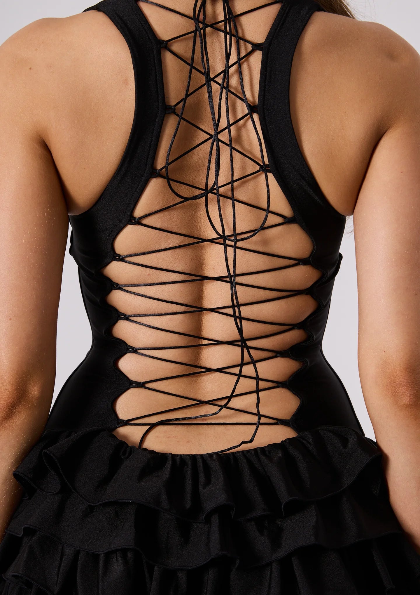 I’m the Madison Mini in Black from Bye Bambi — sleek, sculpted, and impossible to ignore. My body-hugging Vita nylon shapes you like a glove, while my corset boning and lace-up back pull you in exactly where it counts. I serve clean lines, sharp curves, and the kind of confidence that makes a room go quiet.
