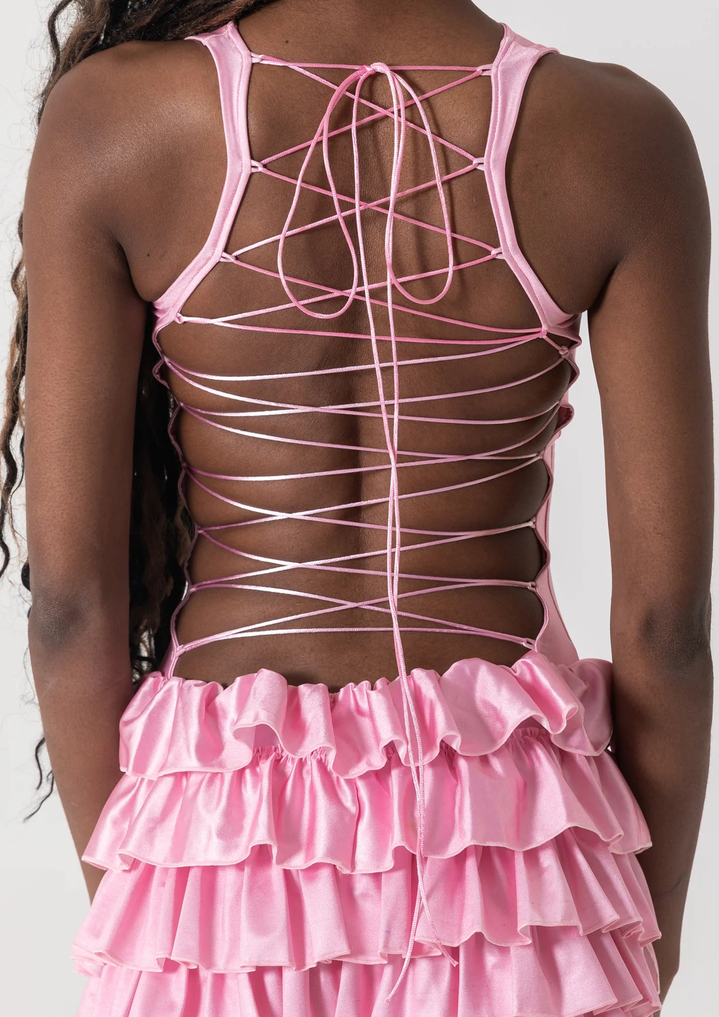 I’m the Madison Mini in Pink from Bye Bambi — soft in shade, lethal in energy. My Vita nylon fabric smooths and sculpts, my corset boning snatches you tight, and my lace-up back keeps every angle irresistible. Feminine, fierce, and made for main-character moments, I’m the dress you choose when you want pretty with power.