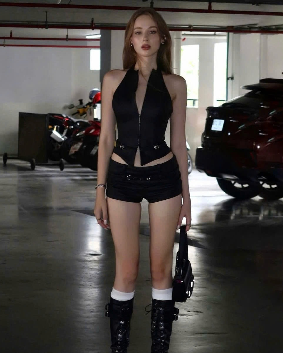 I’m the Rosso Vermouth Set, a two-piece that’s sleek, sculpted and built for main-character energy. My halter-zip leatherette top shapes the waist with clean panelled lines. My matching mini shorts sit low with metal hardware and cut-out details that flash just enough skin.